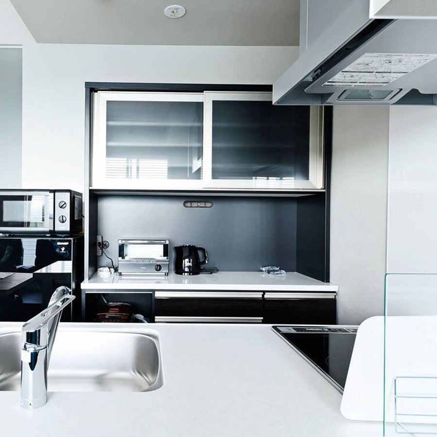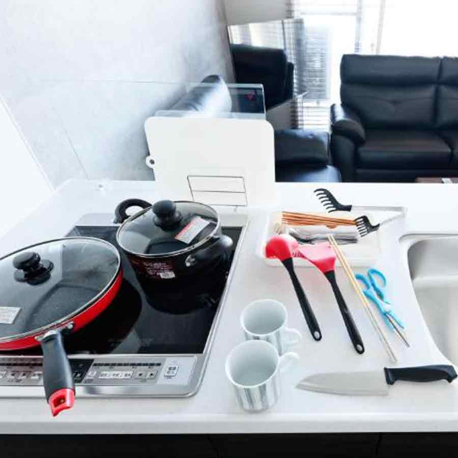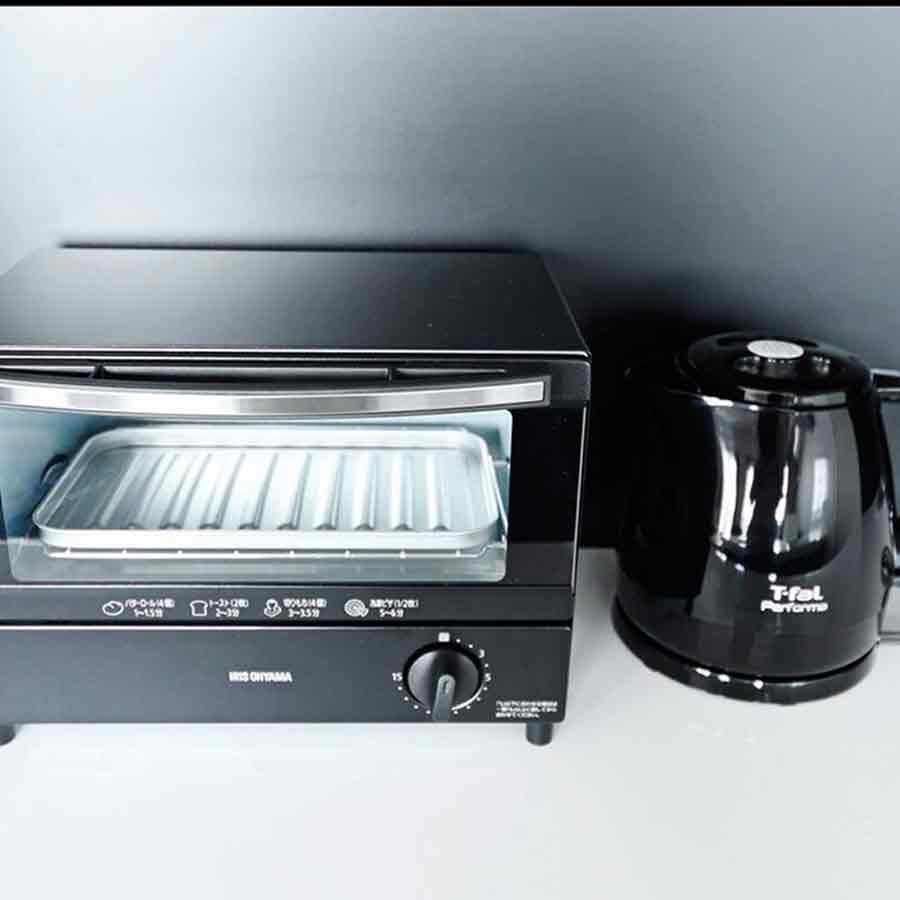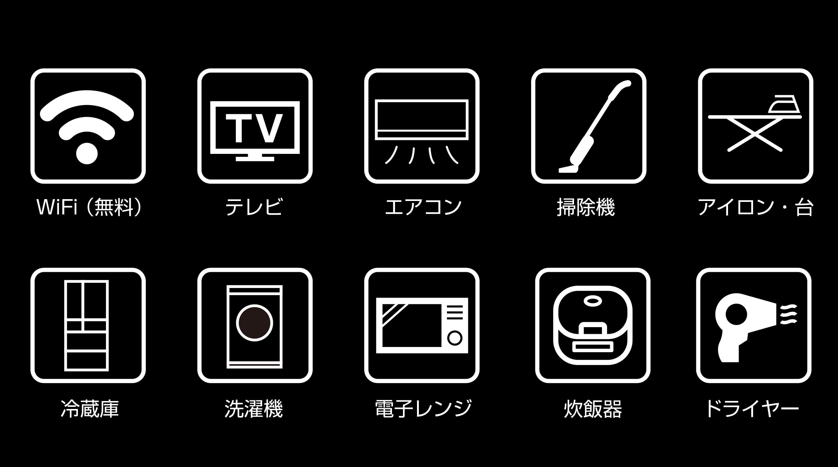 冷蔵庫 / コンロ / 電子レンジ / オーブントースター / 炊飯器 / 電気ポット / 調理器具と食器 / ペーパータオル / 食器洗剤